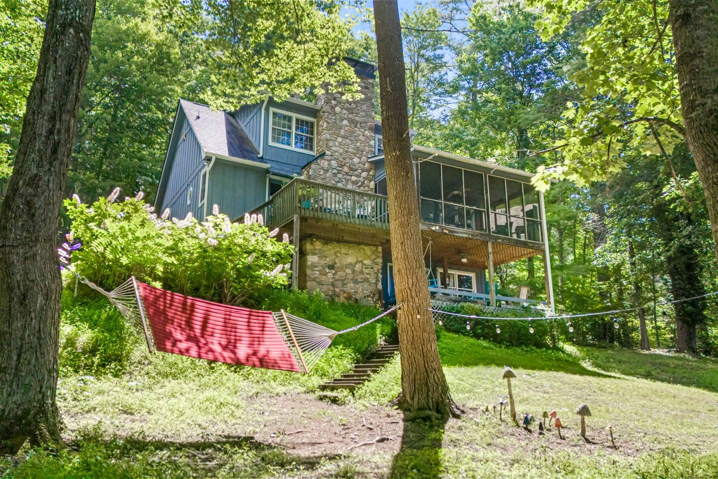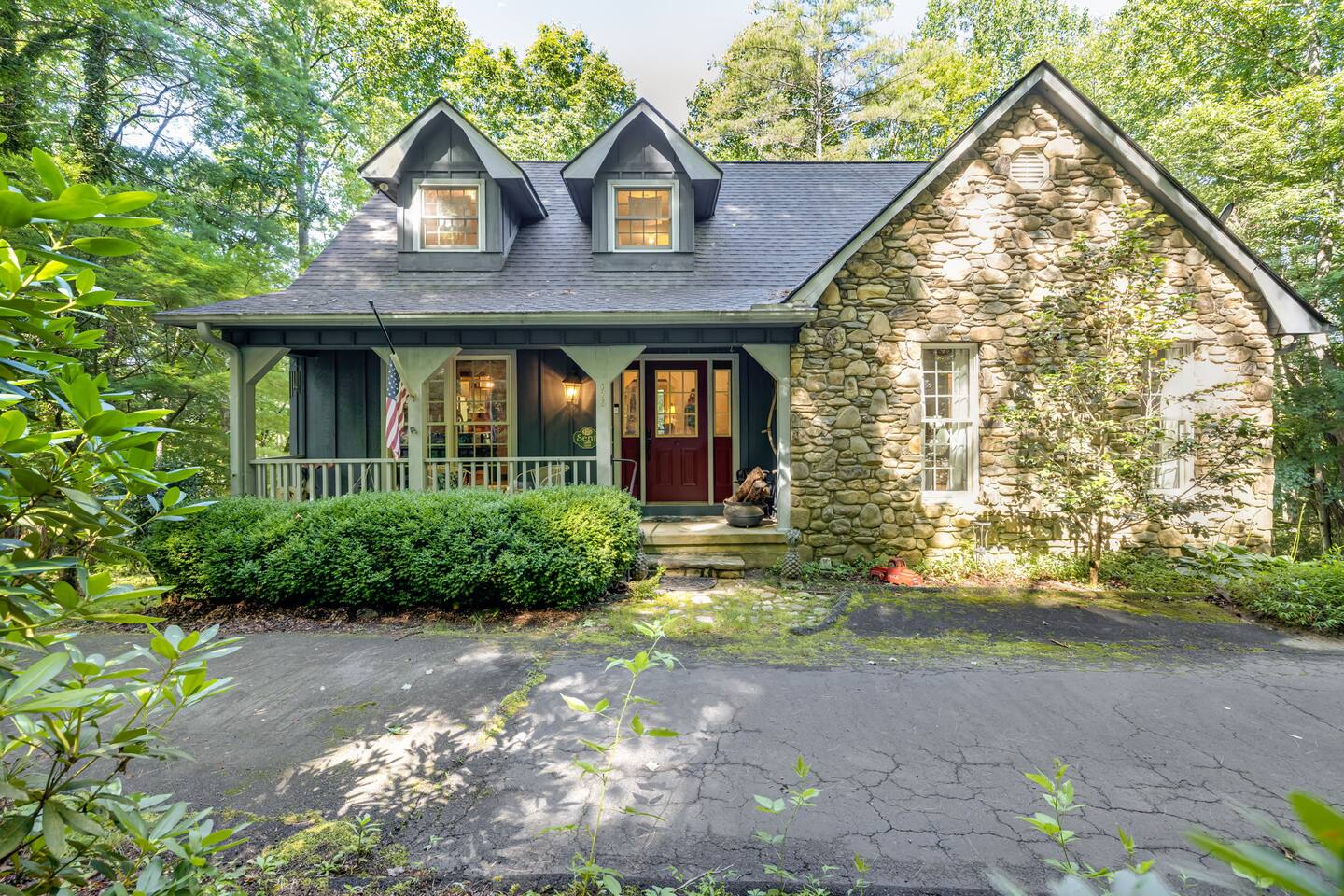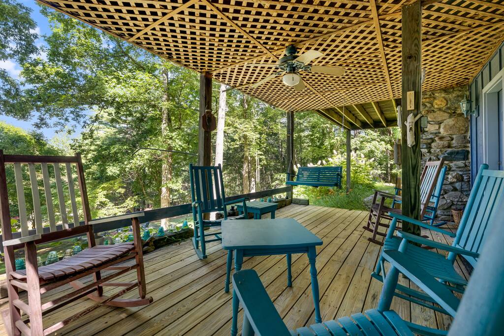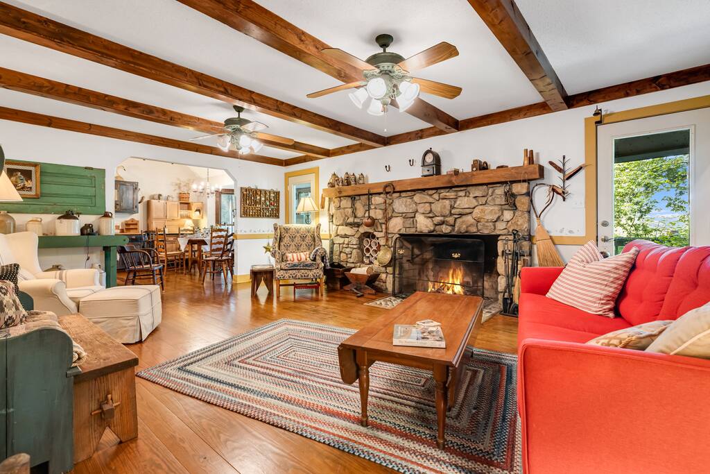 Inside, you’ll find: 4 inviting bedrooms with cozy quilts and vintage touches. The layout includes a full bed in the finished basement, another on the main floor, a third full bed in a smaller upstairs room, and a spacious upstairs primary bedroom with a king bed. 3.5 bathrooms, including a clawfoot tub and dual vanities A wood-beamed living room with a large stone fireplace and comfy seating A fully equipped country kitchen with everything needed to cook and serve A beautiful dining room with forest views perfect for gathering A grand piano for music lovers and a touch of timeless elegance Washer and dryer for your convenience Outside, enjoy: A screened-in porch and a separate open-air deck for coffee or cocktails A covered front porch with rockers and a forest view A fire pit with Adirondack chairs under the trees A propane grill and outdoor dining area for cookouts A spacious backyard with hammocks, perfect for kids or relaxing afternoons Whether you’re hiking the nearby trails, chasing waterfalls, exploring local shops and wineries, or heading to Asheville for dining and culture, this peaceful retreat offers the best of both worlds: quiet seclusion and easy access to adventure—with the airport just a short drive away. PLEASE READ THOROUGHLY We have partnered with Truvi to protect our properties. You will be required to go through a verification process after confirming your booking. You will also be given the choice between paying a refundable deposit ($500) or buying a non-refundable damage waiver ($50) through Truvi. We suggest you buy the damage waiver as this protects you in case you cause accidental damage during a booking.